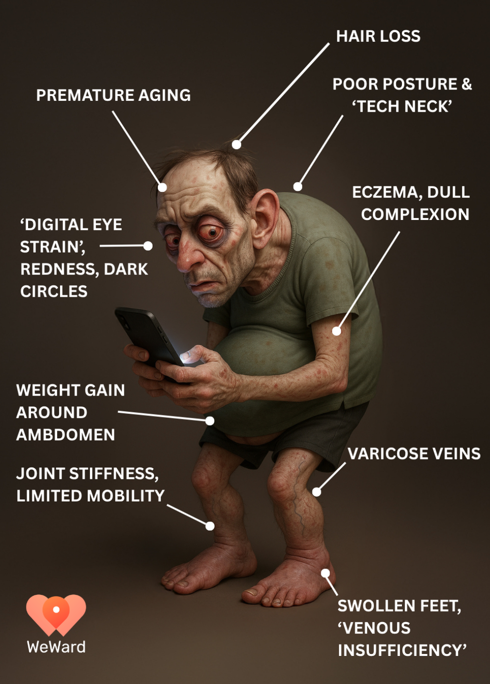 Selon WeWard, Sam est une projection médicalement fondée sur la manière dont l’inactivité peut façonner notre corps et affecter notre santé: à quoi ressemblerait un individu moyen dans vingt-cinq ans (en 2050), si les tendances actuelles ne changent pas? Les chercheurs de WeWard ont combiné leurs propres données, issues des habitudes de marche quotidiennes dans 30 pays, avec des études sur les effets de la sédentarité et du temps d'écran, pour produire cette projection visuelle grâce à l’intelligence artificielle. Et l’image est sombre: fatigue, douleurs chroniques, vieillissement prématuré...