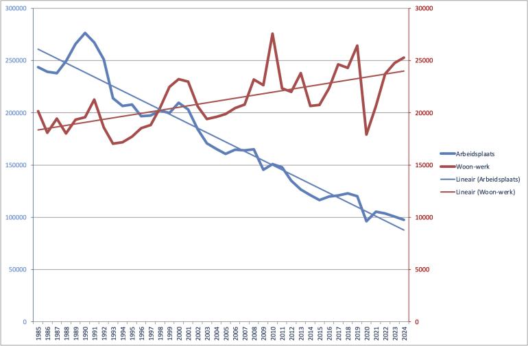 | | Arbeidsplaats | Woon-werk | Totaal | Aandeel woon-werk | Arbeidsplaats | Woon-werk | Totaal | Aandeel woon-werk |