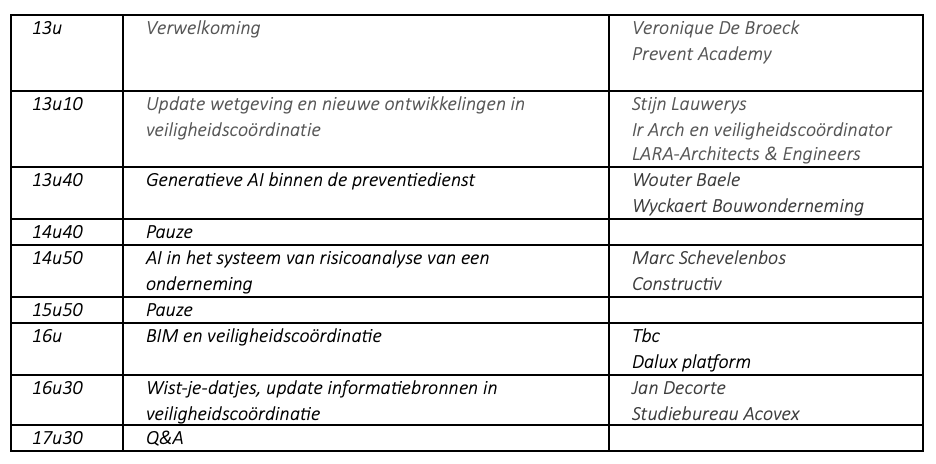 Op vrijdag 12 december organiseert Prevent een specifieke bijscholing over het gebruik van artificiële intelligentie in veiligheidscoördinatie.